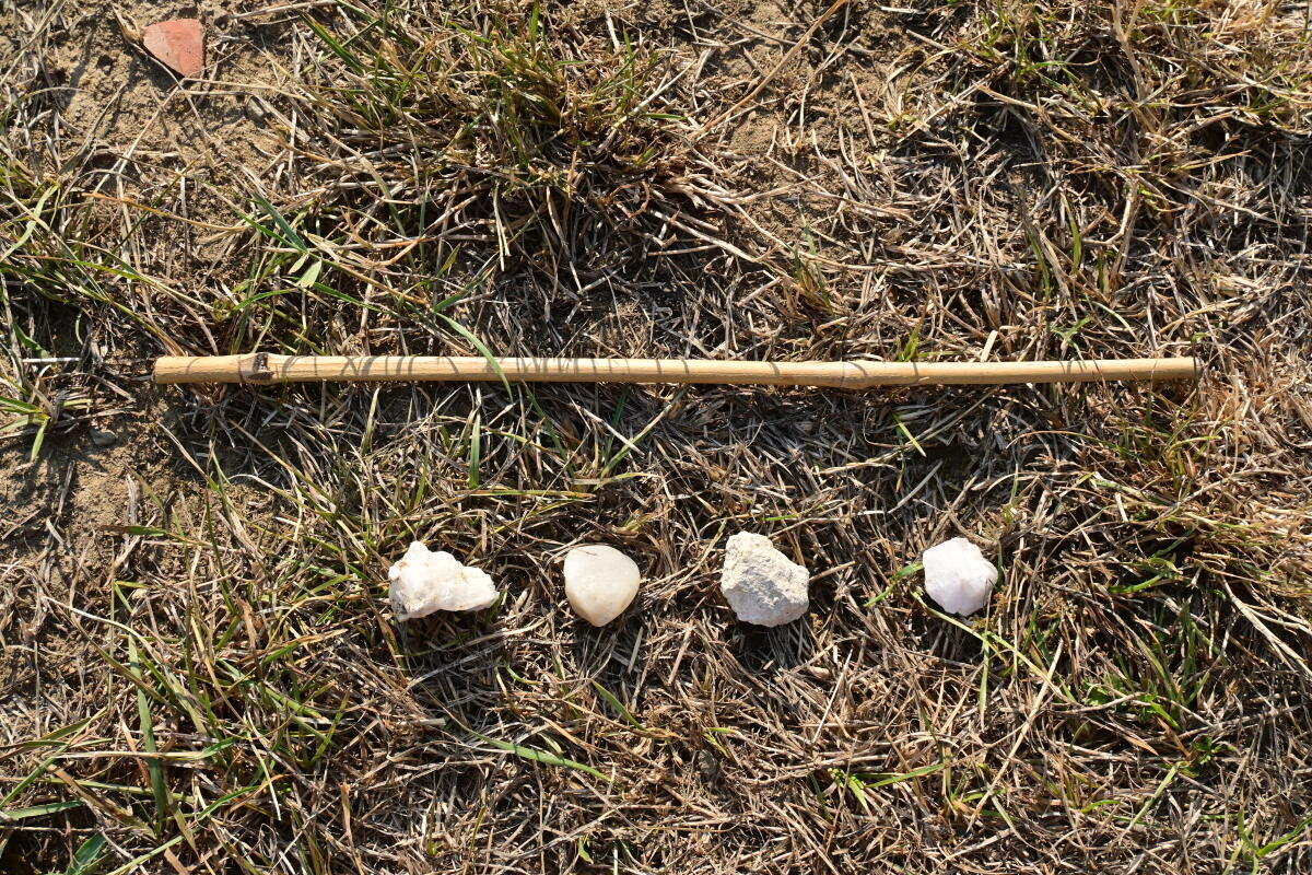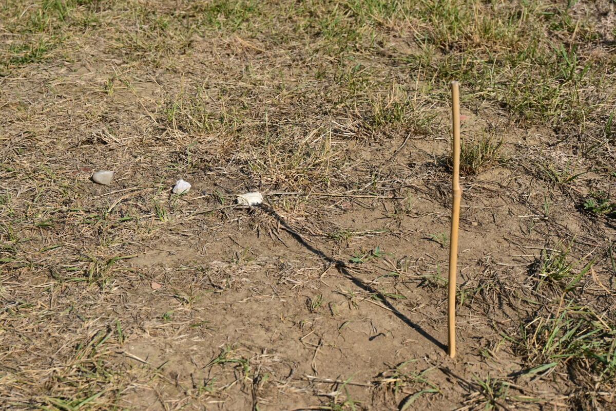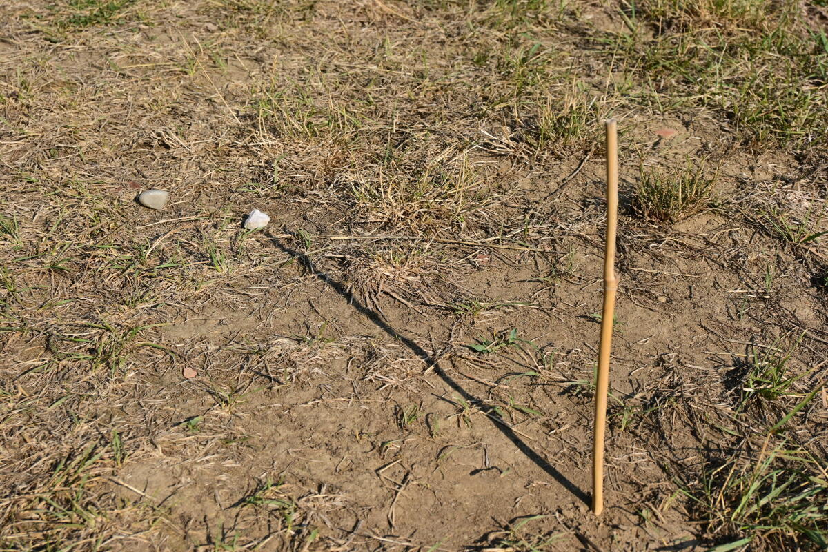 Első lépésként fogjuk a botot, és leszúrjuk a földbe. Majd megkeressük az árnyékának a végét, és odahelyezzük az első követ.